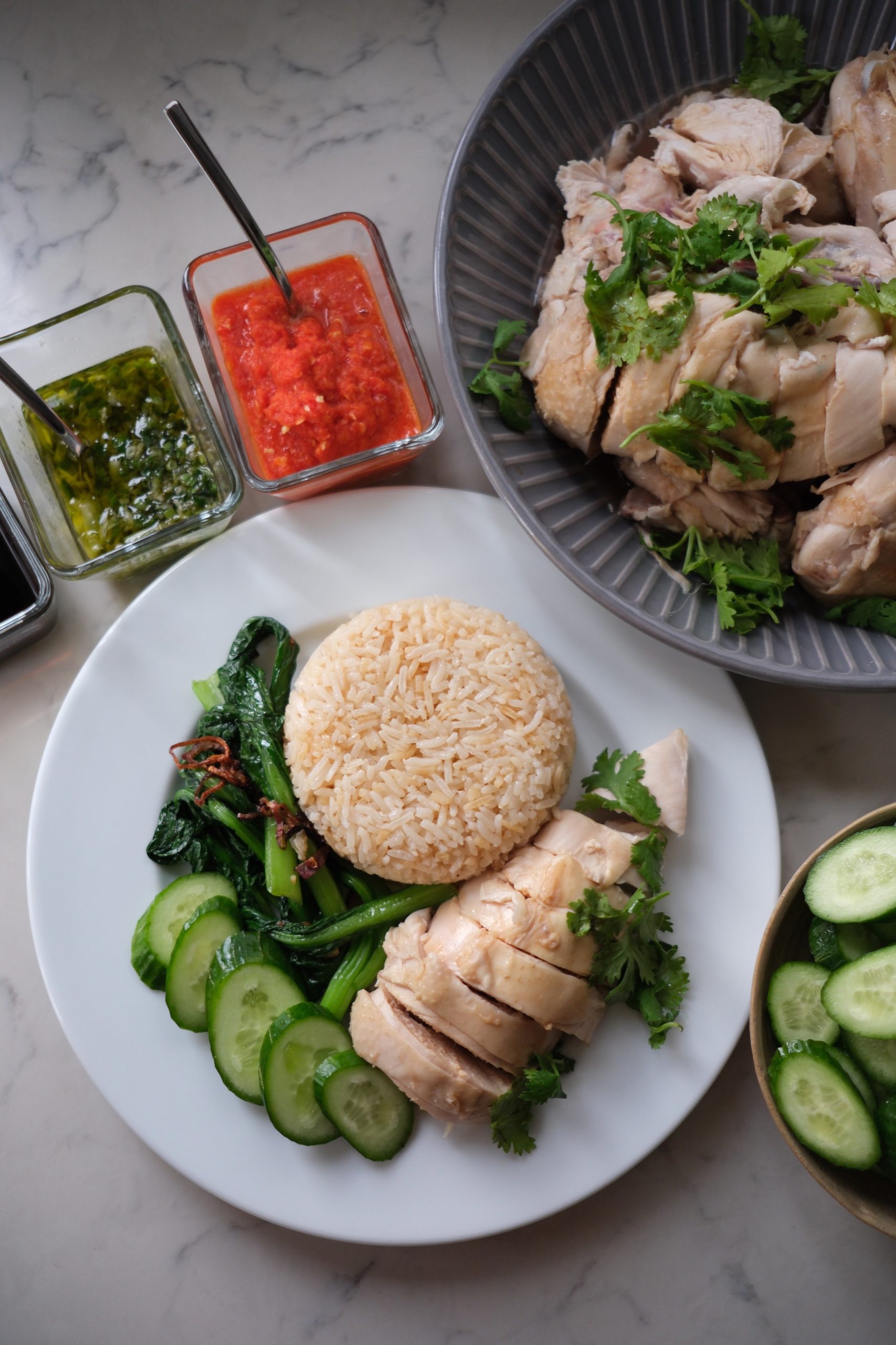 - Serve rice, chicken, spring onion sauce, chilli, dark sauce, sliced cucumber, coriander, and soup.3 sliced cucumbers, 1 bunch coriander
